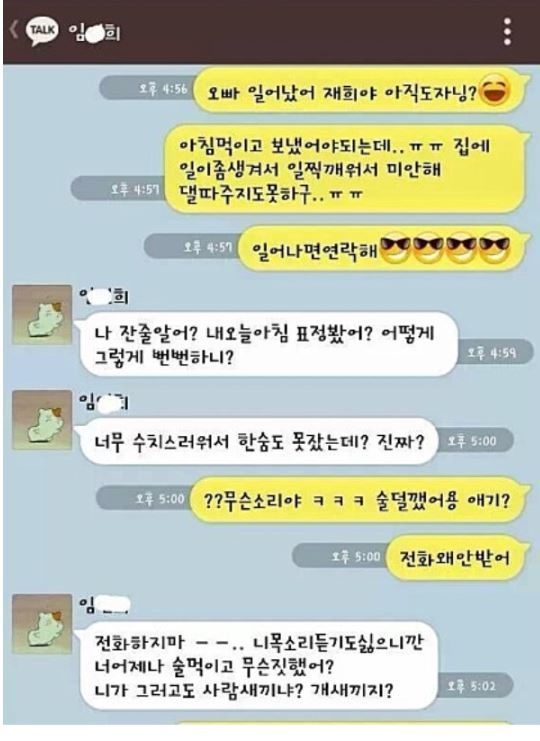 아는 여 동생이 말로만 듣던 꽃뱀?! 술먹고 전화해서 남자를 부른 여자 그리고 그 다음날….. 남자는 기쁜마음에 여자에게 톡을한다…. 그런데 여자의 반응이?! 갑작스런 여자의 경찰서 얘기… 남자는 순간 여자가 무엇을 바라는지 눈치를 챈듯ㅋㅋㅋ 여기서 상황은 반전이 된다! 남성차에서 블랙박스 영상에 녹음된 여자의 음성…. 여자는 순간 X됐다 생각함 역으로 고소당할 위기에 처한 여자…. 나도 뒷 이야기가 궁굼하다 ㅋㅋㅋ
