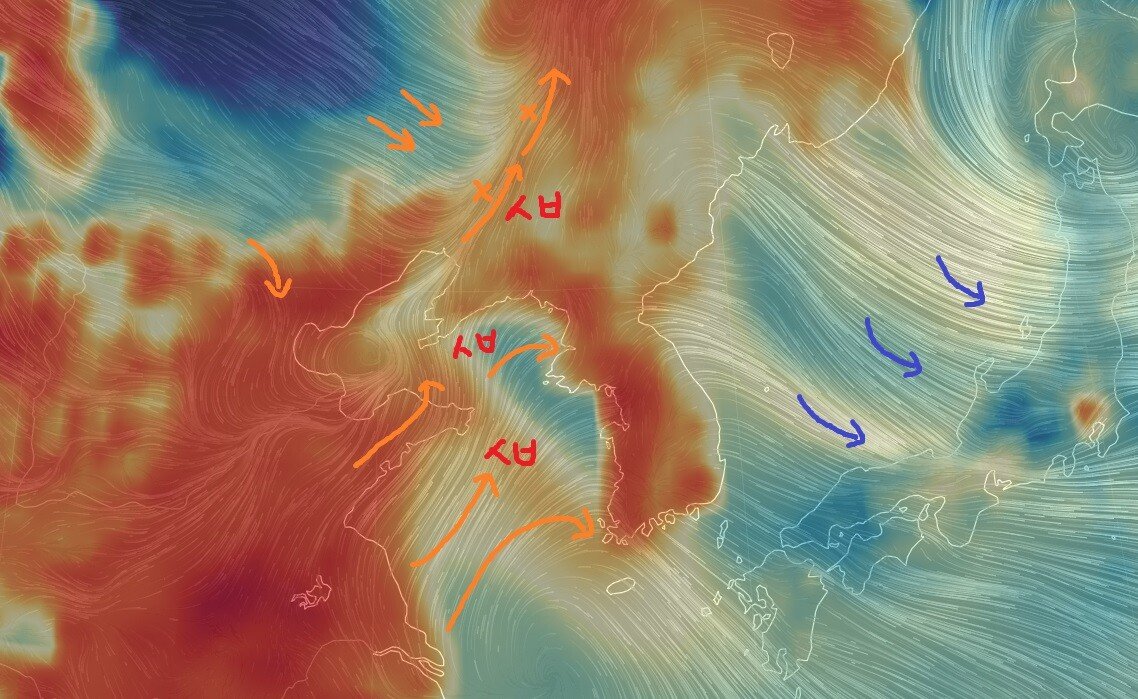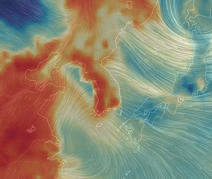 북쪽에서 내려오는 바람을 차단선을 가동해서 막는 모습.