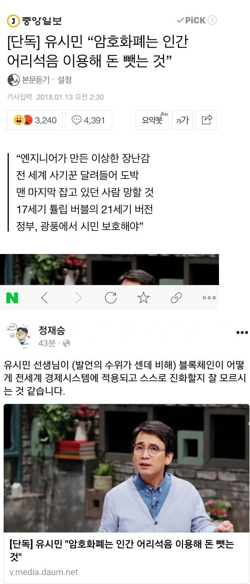 근데 유시민이 뇌썩남이 것과 별개로 유시민은 가상화폐 거래와 투기에 대해 이야기하고 있고 정재승은 블록체인 기술에 대해 이야기 하고 있음