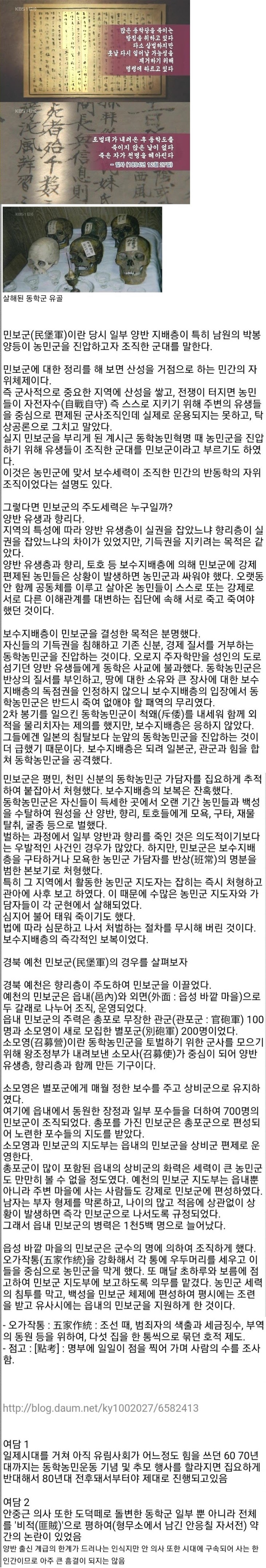 솔직히 저때 일본에 대항한 동학농민전쟁의 민족적 의의는 대단하지만 그 전후에 기득권층에 대한 동학군의 평등운동은 거의 프롤레타리아 폭력혁명 급이었음. 활빈당같이 탐관오리나 부정축재자를 벌하는 게 아니라 양반이면 그냥 잡고서 망신주고 죽이는 지경이었으니...